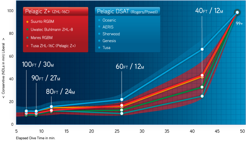 For more information and detailed “Liberal vs Conservative” algorithm comparison charts – see Scuba Diving Magazine’s ScubaLab “Digging Deep on 2009’s New Dive Computers”.